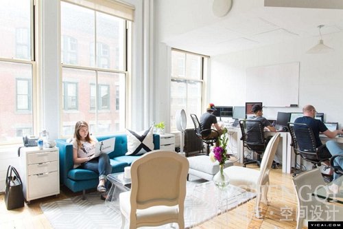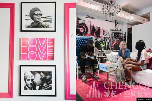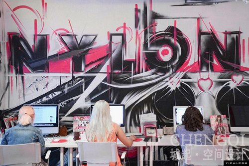 如果公司有最具代表性的颜色,就可以作为空间的设计灵感,但要能取悦所有人还是很艰难,即使是公司 logo 的颜色。解决办法是可以挑出一块功能性的区域,来使用出挑的颜色。就像 Nylon 杂志新装修的纽约办公室,编辑区的一头是一块动感十足但颜色简单的黑白涂鸦墙 ,但人物的指甲和极少地方的纹路用了 Nylon 标志亮粉色点缀。